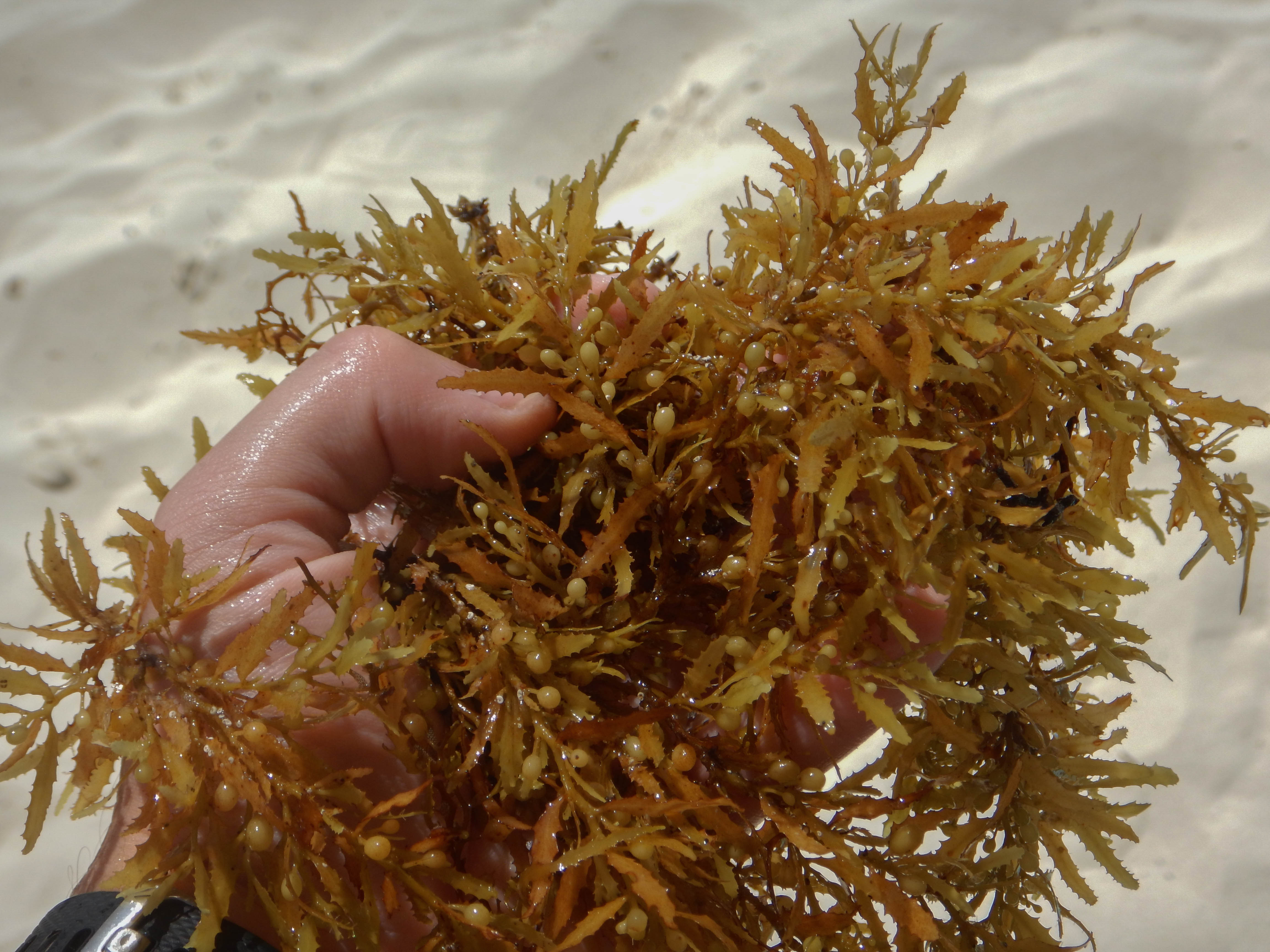 Sargassum is a genus of seaweed common in the Caribbean. Though it may appear like one, it is technically not a plant and is instead a form of multicellular algae. The nodules visible are filled with gas and help the seaweed float.Sargassum typically gathers in large mats. The common presence of such mats in the Atlantic Ocean near the Caribbean caused the region of ocean to become nicknamed the Sargasso Sea. While these mats form crucial habitat for a large number of creatures, in recent years, rising temperatures have caused their population to explode. This has, in turn, caused issues with large amounts of Sargassum washing ashore, clogging beaches, and choking out other forms of life. In the worst cases, it becomes thick enough to disrupt navigation by tangling with the propellers of small craft.