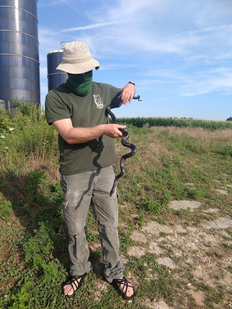 The Black Rat Snake is a large snake common throughout the Eastern United States. It is non-venomous and poses no threat to humans. When threatened, it prefers to run instead of biting and it is fast enough that it usually can escape from humans with no struggle. The one in this photo was asleep in a spot that it was going to get run over so I picked it up to move it. They were not happy about it but even at their angriest did not bite me.