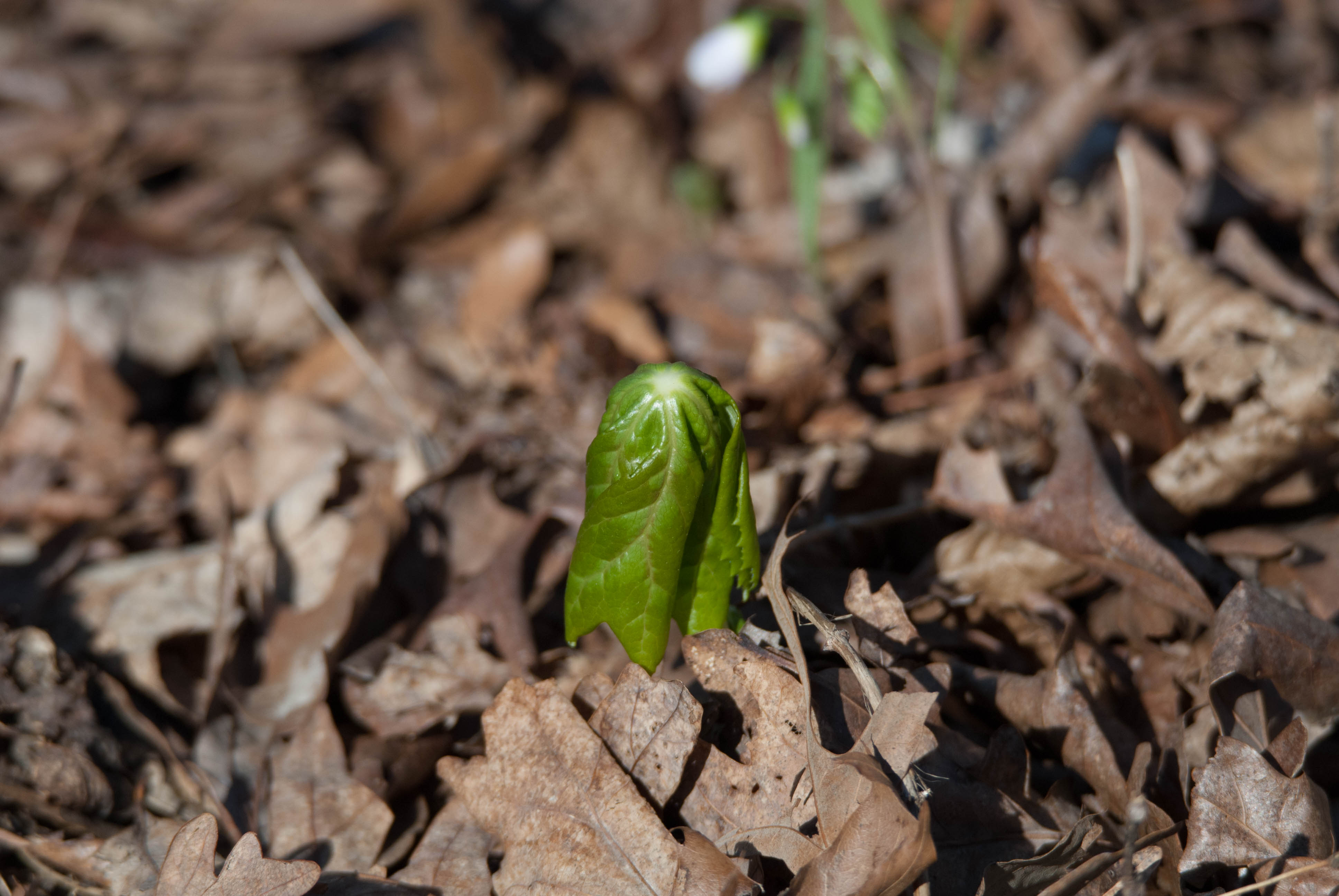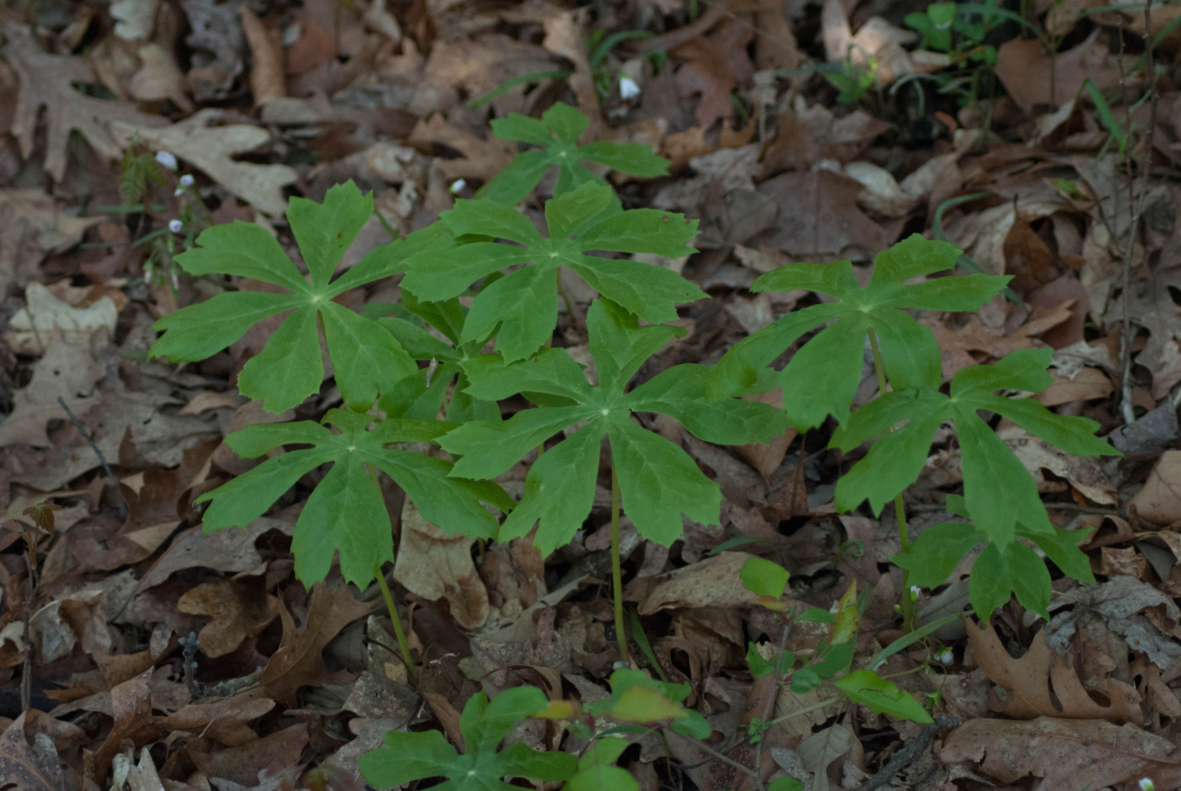 Mayapple is a forest floor plant that is found throughout the eastern United States and the southern part of Ontario. It is toxic for human consumption with the exception of ripe fruit. Unripe fruit is still toxic. It has a flower that can be difficult to see from the human eye level, and is, overall, a relatively unassuming plant to most people. However, it fills a critical niche in forest floor ecosystems as a food source for many animals and an important part of soil stability. The Mayapple emerges from the ground in early spring and produces flowers in late spring. By the end of the summer, the entire above-ground structure is dying back, and there is no visible presence of the plant during the fall and winter. This ends up giving many people the impression of it being an annual plant. In fact, it will spread thick root networks that live over the winter and will send up new shoots in the spring. A single colony, once established, can live for an exceptionally long time.