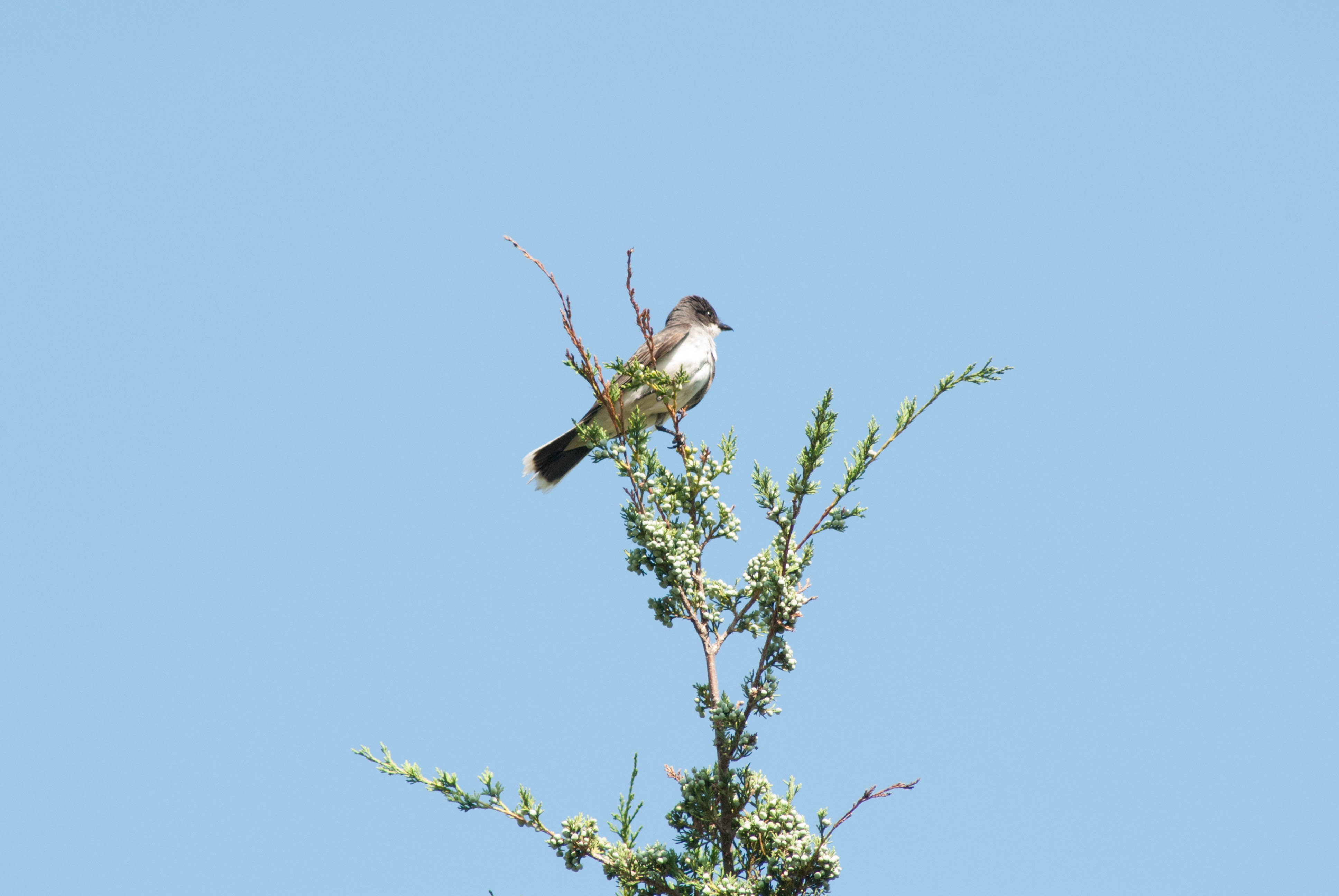 The Eastern Kingbird is a highly migratory bird. It spends its winters in the tropical latitudes of Central and South America. Come summer, it travels North, where it can be found in most of the US and Canada. There is no overlap between its summer and winter range, and there is a significant gap where they are only found while migrating in the spring and fall. This bird is a member of the Tyrant Flycatchers, and like most of that family, it eats almost exclusively insects. It is common to see them swooping through the air to catch their prey on the wing. They do often supplement their diet with fruit, especially during the winter.