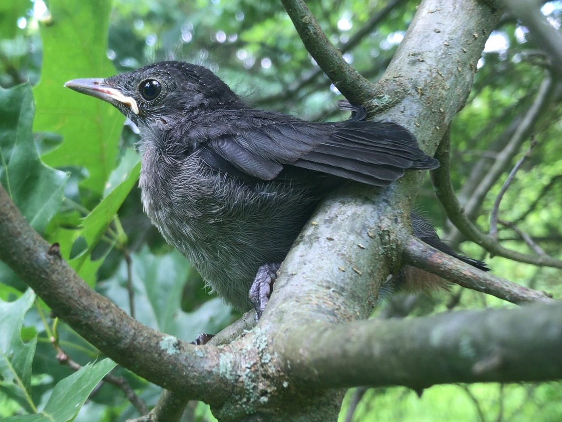 This particular bird is a fledgling that wasn’t quite ready to fly away. It enabled me to get a bit closer to it and get such a good picture with only a phone. An adult will be mostly a smooth, solid gray. On the top of their head is a black stripe, while the patch of feathers under the tail is a dark rusty red color. This juvenile still has a scruffier appearance, coming from its down feathers not being completely covered by contour feathers.