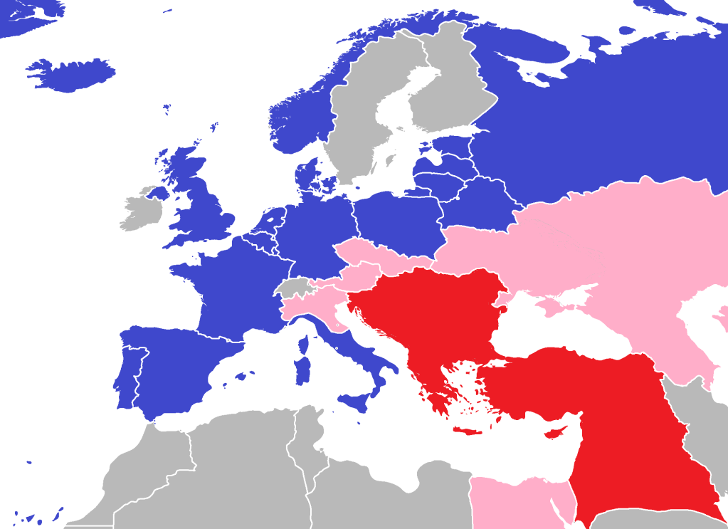 A map showing the political alignments of various European, Middle Eastern, and North African countries after the Partition of Russia and the onset of Phase Three of the Cold War.