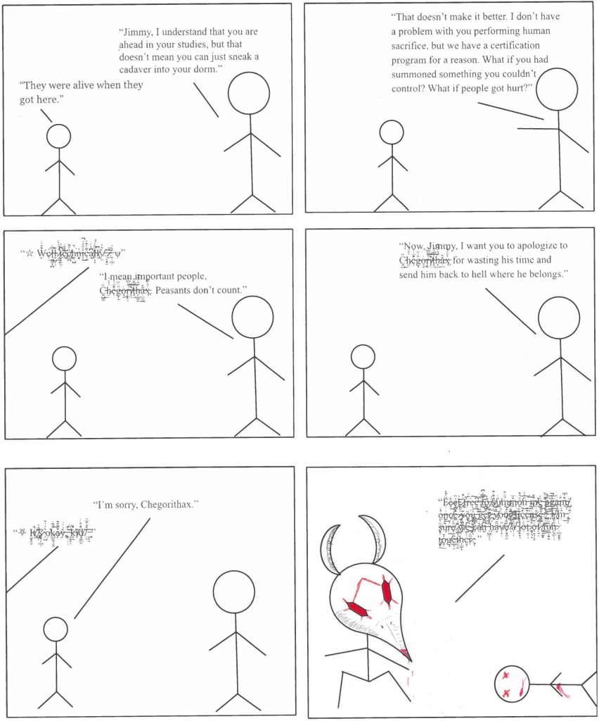 I’m not exactly the best at the visual arts outside of photography. This was created as a part of a college class about the structure of comics. I was asked to create a comic that mimicked the style of a comic I was analyzing. The stick figure style and odd take on lab safety protocols was officially a rendition of aspects of XKCD, but it’s also a visual adaptation of my story “Deadly Dorm.”